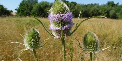 Tésen, kb. a falu közepén parkoltuk le az autót. Egy ideig gondolkodtunk, hogy a kék sáv jelzése mentén ereszkedjünk-e le Jásd felé, vagy inkább a kék négyzeten, Római-fürdő irányába kezdjünk. Végül ez utóbbi mellett döntöttünk, mert ez enyhébben ereszkedik, mint a Jásd felé vezető, és párom aggódott, hogy térdei rosszul tűrnék a meredek, gyorsan szintkülönbséget vesztő kék sávot. A falu csendes, sok eladó házzal. A szeszes italt is forgalmazó vállalkozás teraszán volt egy kis élet. Mondjuk, ebben a melegben kellemes lehet egy sör mellett ücsörögni. Korábban – egy másik túra alkalmával – voltam bent, és tetszett, hogy az idős tulajdonos elvegyül a vendégek között és beszélget velük. A szélmalmokat kihagytuk, mert engem zavar, hogy egy ház udvarán kell oda keresztülmenni. Vízvételi lehetőség van, legalábbis a temető mellett láttam egy közkutat.
